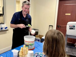 Grand Knight Patrick Meere serving parishioners at a recent ice cream social.